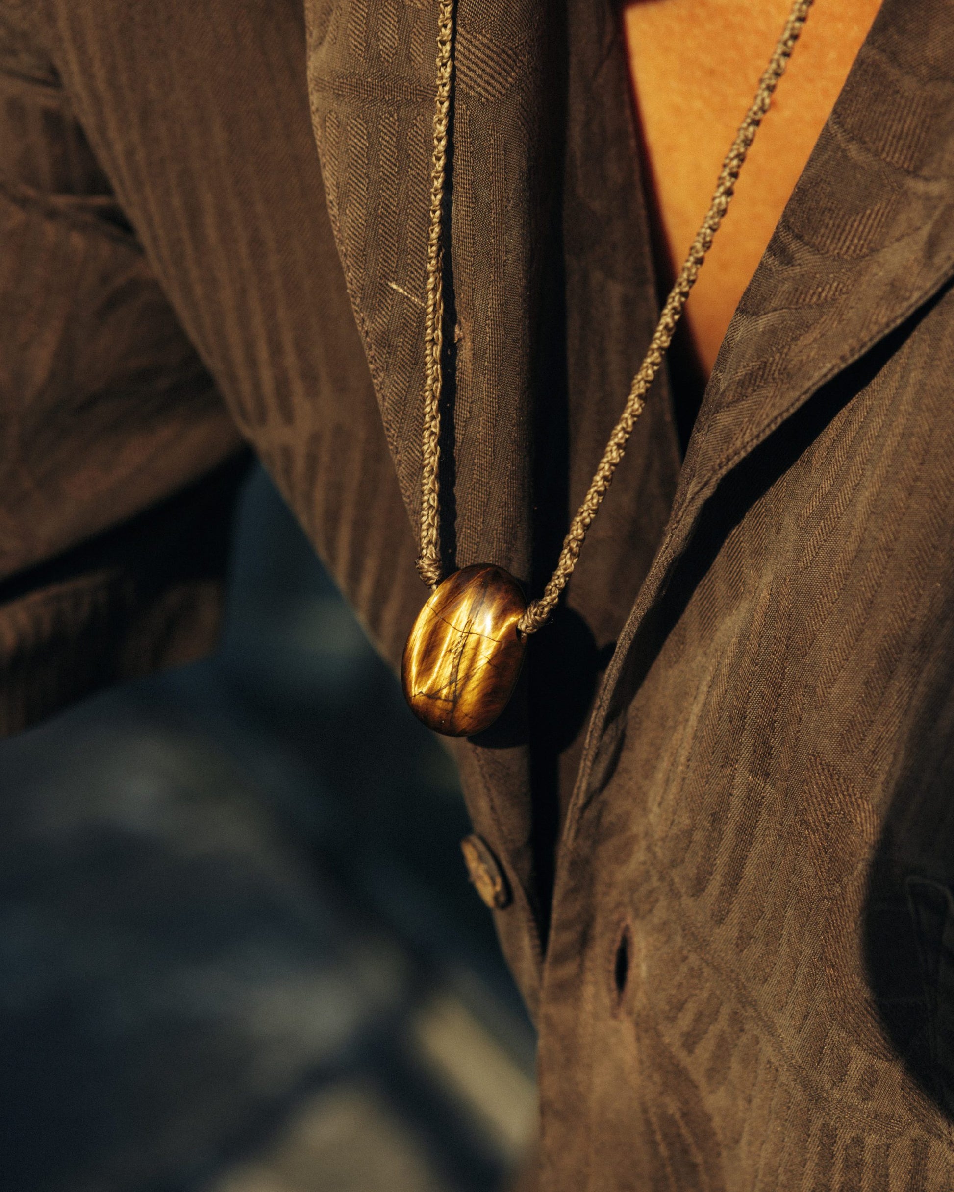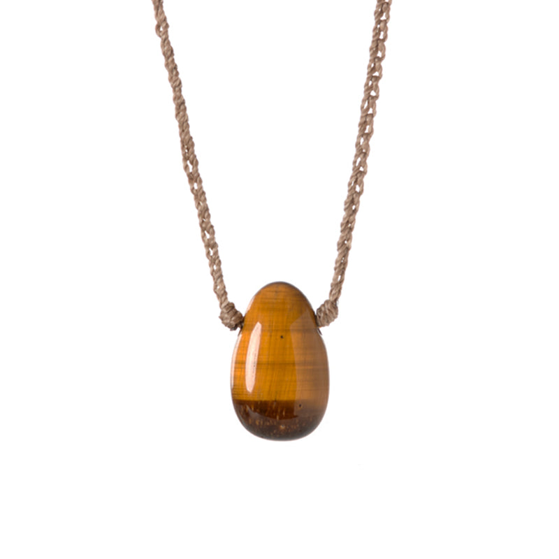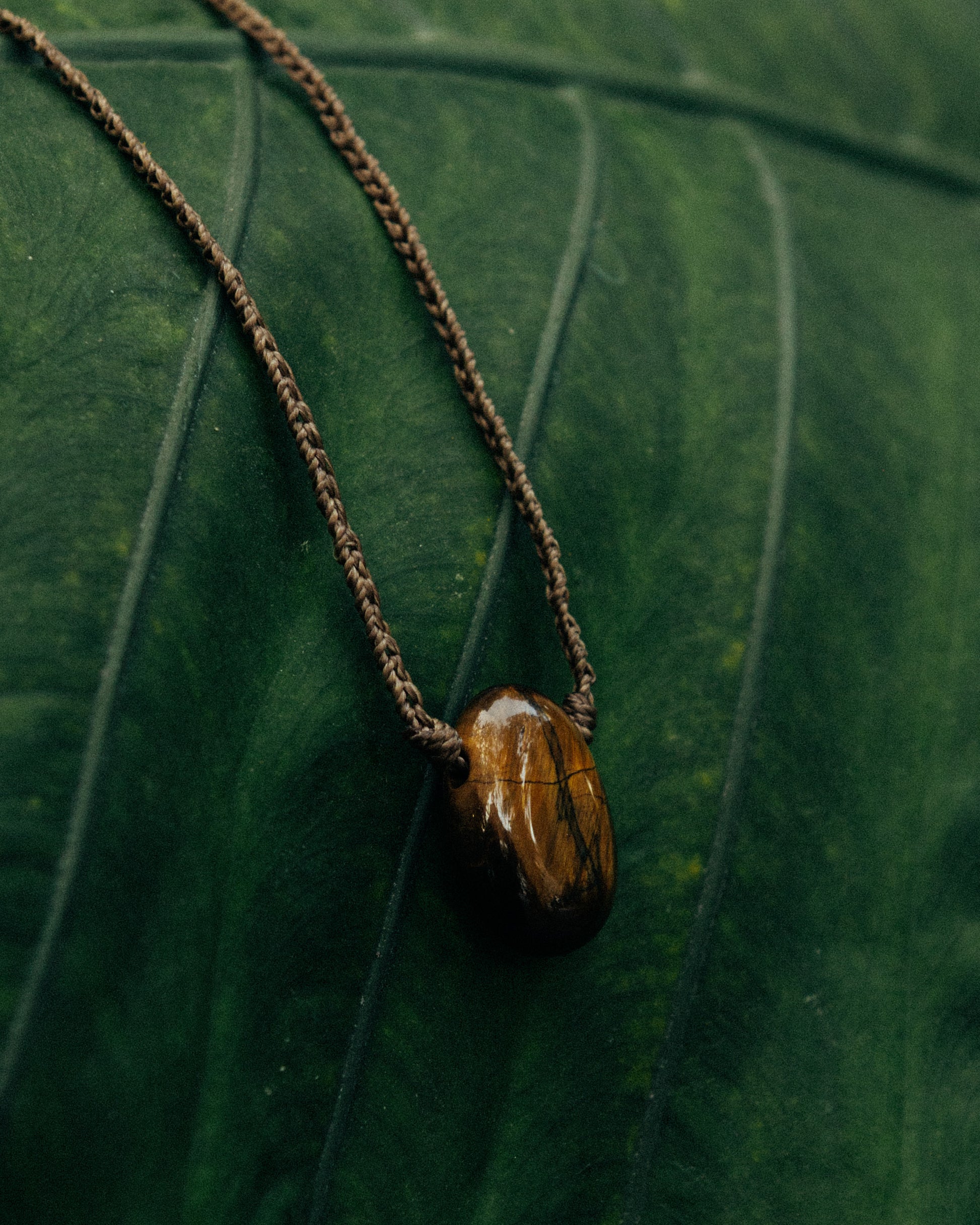 Collar de piedra natural Ojo de Tigre de aproximadamente 2,5 - 3 cm de alto. El cordón está hecho con hilo encerado de poliéster de color marrón trabajado a mano mediante técnica de macramé.